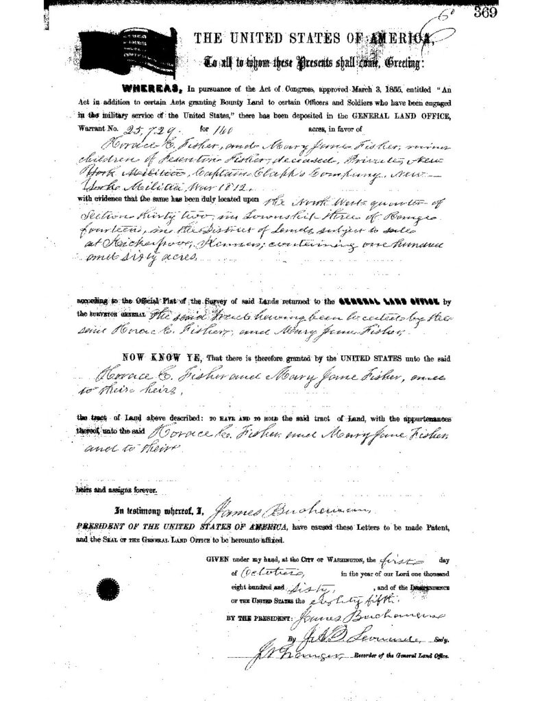 There it was: a military bounty land patent, issued in 1860—not to Fessenden himself, but to the familiar names of his children: