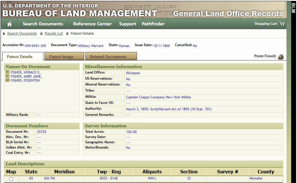📄 Search result and scanned land patent from the BLM GLO Records site. This 1860 document confirmed Fessenden Fisher’s service and named his minor children, Horace E. and Mary Jane Fisher, as heirs.